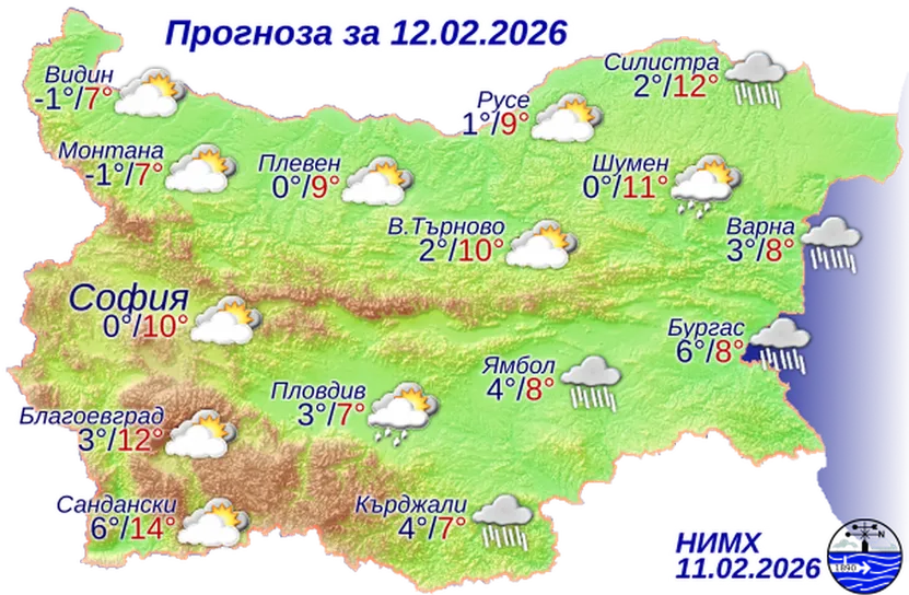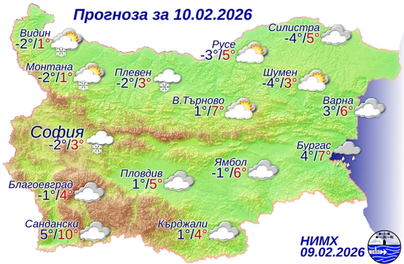 Максималните температури ще бъдат предимно между 2° и 7°